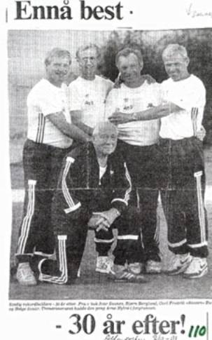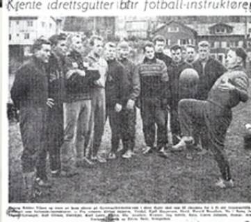 (Her er trener Arne Nytrø foran og bak ham fra venstre: Helge Svaar, Bjørn Berglund, Carl Fredrik Bunæs og Ivar Saunes, som alle er nevnt mange steder i siste kapittel av denne bok.)