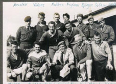 Bak fra venstre: Arnstad, Vidnes, Bråten, Fuglem, Bjørgen, Solem, Sæter - Midten : Helland og Tor Kleveland (RBK-fotball) Foran: Min troppsjef, fenrik Willy Myhre, Svorken, lt. Leif Rødsjø, fenrikene Trond Holand og Inge Hagen.