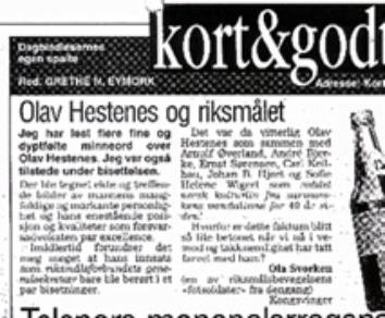 Jeg har også i andre sammenhenger irritert meg over at personomtaler ofte utelater ting som for meg synes viktigere enn mye av det som nevnes! At min påpekning av dette forhold for Hoels vedkommende falt i god jord hos Riksmålsbevegelsen sentralt, og således sakset i Ordet nr. 1 -1991, gleder meg stort. Heldigvis kom et skikkelig offisielt minneord over Hestenes i riksmålssammenheng i Aftenposten 23/12-96. Bent Harris Evandt tegner her et meget adekvat bilde av hans formidable innsats for riksmålssaken og hans sterke og fine personlighet.
